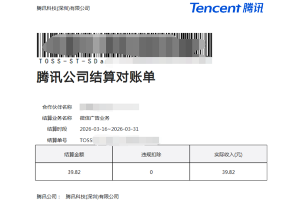 本来还在纠结今天要写什么东西呢,刚刚又去微信公众号后台看了一眼,猛然发现三月份下半个月的广告收入已经显示“已结算”了,而且看到了显示绿色的“补发结算单”字样。打开邮箱看了一下之后,看到周三也就是前天的时候就已经收到了名为“腾讯公司结算对账单”的票据邮件,邮件名是“腾讯微信广告流量主结算”。